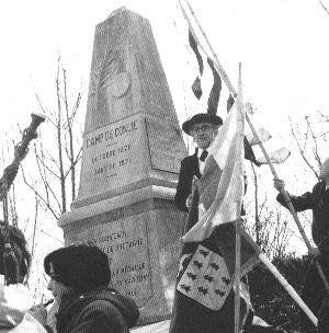 Le monument de l'Armée de Bretagne Edifié en 1913 sur l'emplacement du camp de Conlie, ce monument domine le coteau de La Jaunelière, en bordure de la route du Mans à Sillé-le-Guillaume. Une plaque sera posée par la suite - l'inauguration ci-contre - à la mémoire des "Bretons trahis au Village de Boue de Conlie" "D'AR VRETONED TRUBARDET E KERFANK-CONLIE" |